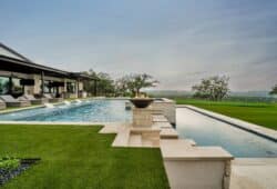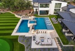 Pool-spa combo with an infinity edge on the spa spilling over to the tanning ledge. This also includes decking.
